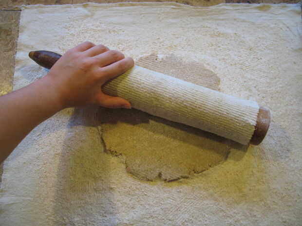 Coloque una bola de masa en el centro de la tela de pasta, espolvorear harina en la parte superior se y comenzar a rodar hacia fuera.