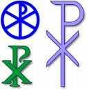 Nos parece una "P" y una "X". Ya sabes que la "X" es un chi, es la primera letra en el deletreo griego de 'Cristo' y tiene un sonido "CH". La "P" es un rho. Tiene una "R" sonido y es la segunda letra en el deletreo griego de 'Cristo'. El gráfico muestra tres variaciones sobre un símbolo Chi Rho. Se puede ver en banners, en los altares, en vestimentas clericales y en la joyería.