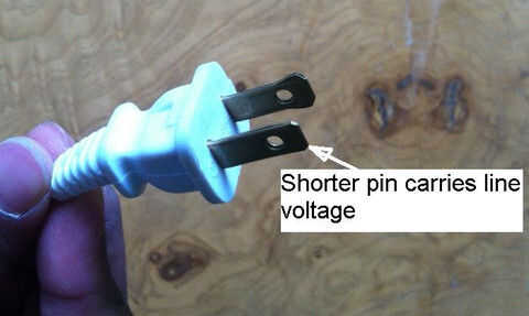 a continuación te alambre el lado AC. Tome el cable de extensión y localizar el cable que lleva la tensión de línea. Si está utilizando un enchufe en los Estados Unidos, el pasador que lleva la tensión de línea es el más corto tal como se muestra en la siguiente imagen: