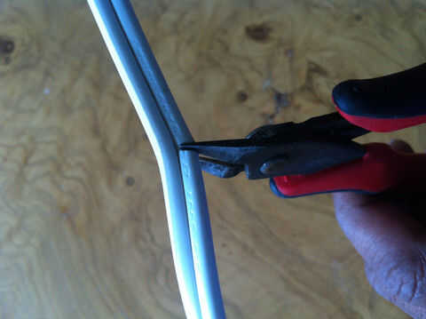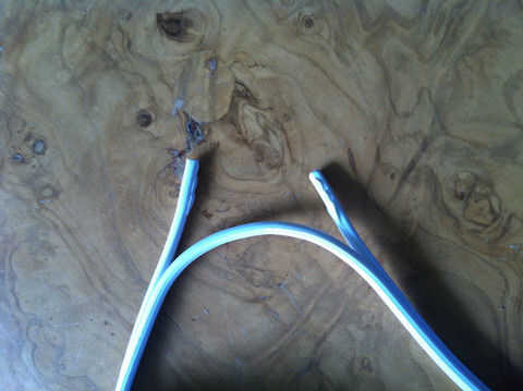 a continuación cortar y pelar el cable conectado al pin de llevar la tensión de línea como se muestra en las imágenes a continuación (nota que debe cortar solo el cable que va a llevar la tensión de línea solamente, no dos cables):