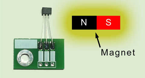 Primer lugar tenemos que detectar la posición de la puerta. Una manera fácil de hacerlo es mediante un sensor de efecto Hall. Estos sensores reaccionan a un campo magnético. En otras palabras, colocar un imán cerca de un sensor de efecto Hall cambia su salida.