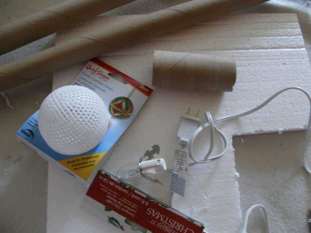 Para la lámpara que necesitaremos una bombilla de pequeño clip (disponible en el pasillo de la decoración de Navidad), el tubo de cartón interior utilizó encima de rollos de papel higiénico 4 thermocole, pegamento, cinta, toallas de papel, accesorios de elección escogí una punto forma esférica (por un dólar) y unos conos de pino.
