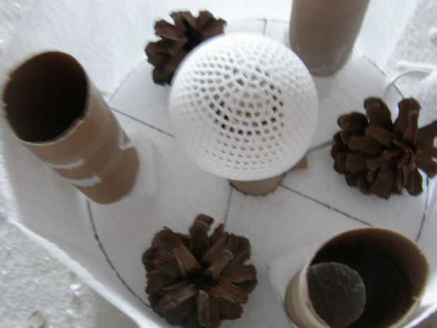 Coloque la mitad de la esfera de la forma de punto en el bulbo. También usé los conos de pino aquí.