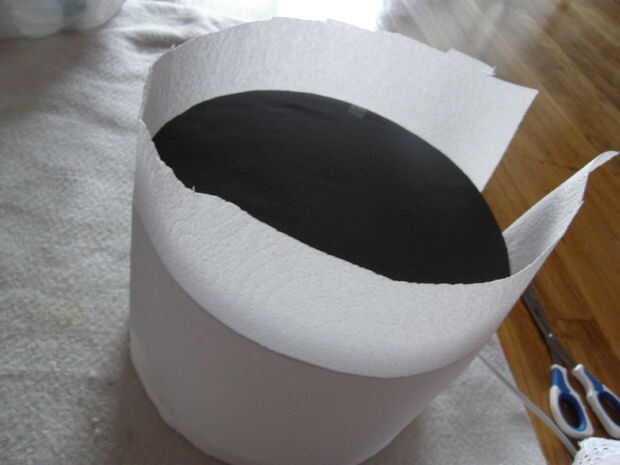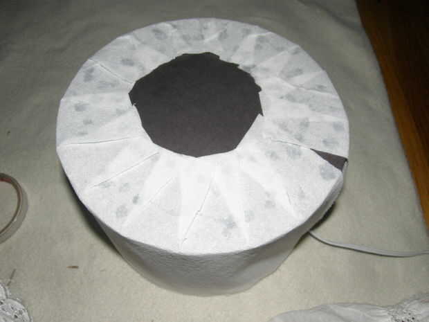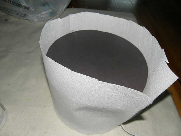 Cortar un círculo en el mismo plato (que era utilizado para la base) de un trozo de cartulina y cerrar la lámpara. Use toallas de papel para envolver suavemente el cartón rollo pilares y cierre sobre el cartón superior.