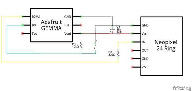 Ahora que el caso se hace, es tiempo para idear un circuito electrónico que los LEDs. Como se puede ver, se que me ocurrió es bastante sencillo. El centro está el Arduino compatible Adafruit Gemma. Usé sólo dos líneas digitales de los tres que tiene. Uno conduce el anillo de Neopixel, el otro está conectado al botón. Quería un botón en el proyecto por lo que podría han cambiado de un sistema de iluminación a otra. De hecho, como se verá más adelante cuando se presiona el botón, la luz se moverá al carrusel siguiente de color. Estoy seguro que usted puede encontrar otras maneras de usar el botón, en caso de que decidas cambiar el programa que se ejecuta en Gemma.