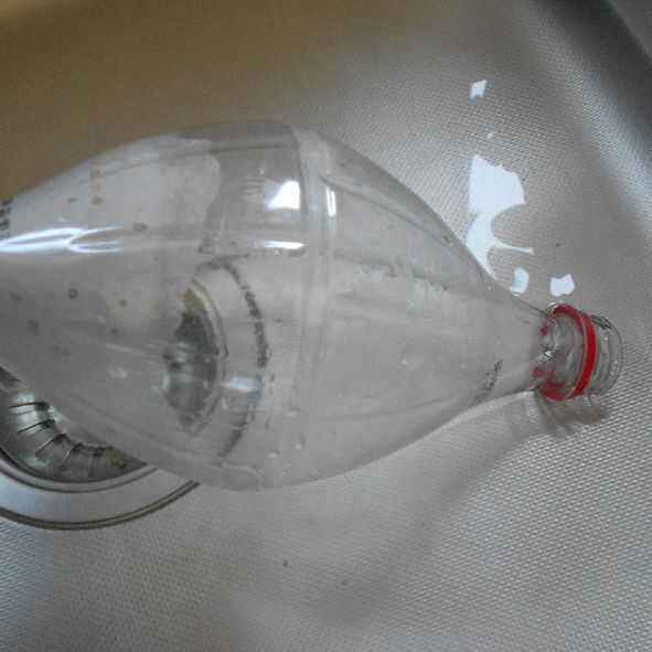 Donde se corta 5mm debajo de la sección decorativa es donde quieres tener dos secciones superiores se unieron. El agua caliente también ayuda a 'pop' las botellas en forma si ser abollados. También puede utilizar el mango de una cuchara de madera para meter dentro y abolladuras pop out.