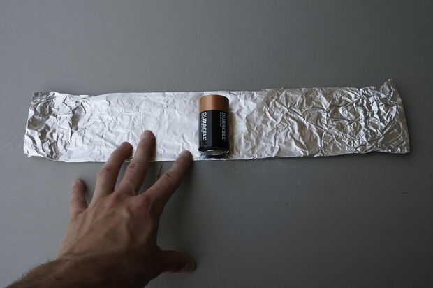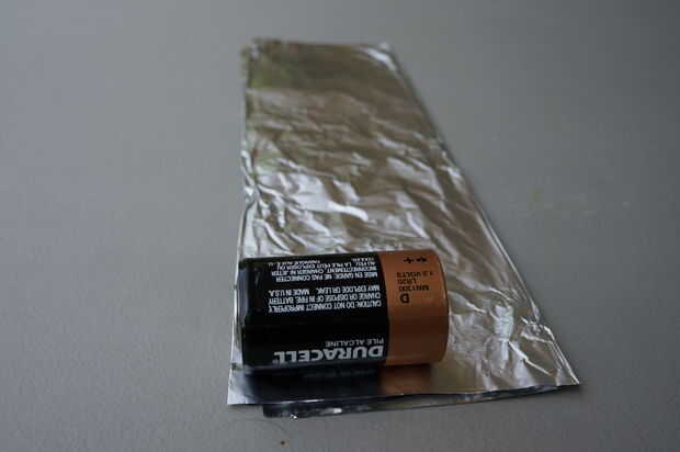 La belleza aquí es que nada tiene que ser exacto para que funcione, sólo cierre. Después de que el plegamiento sea completado debe tener una tira larga de papel de aluminio que es ligeramente más alto que la batería.
