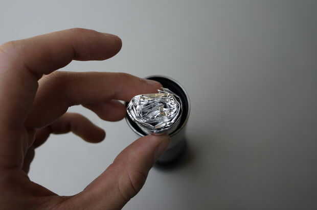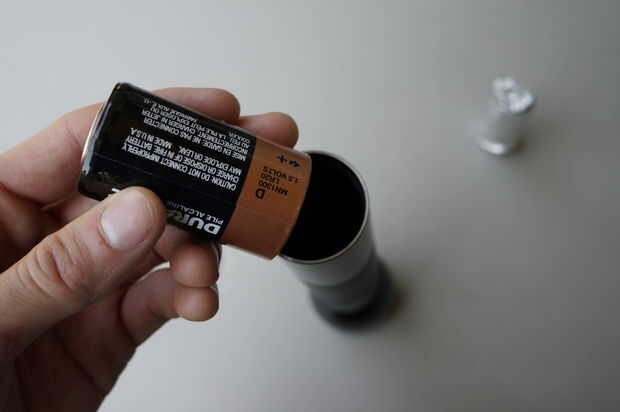 El real de la batería en primer lugar. Siga con el tubo de papel de aluminio en lugar de una segunda batería. Asegúrese de que todo está bien situado y enroscar la tapa de la linterna. Si hiciste un tubo que es ligeramente más alto que la batería podría ser un poco más difícil a enroscar la tapa. Mantenga presionando y se aplasta hasta la altura adecuada. Recuerda que esto va a funcionar mejor que un tubo es demasiado corto.