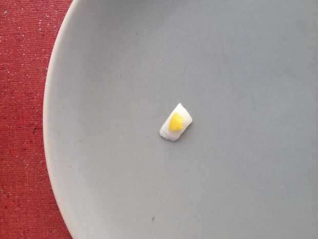 Corte una astilla de bulbo de hinojo blanco ligeramente más pequeño que la uña del índice. Coloque en el lado izquierdo de la placa y la tapa con un trozo un poco más pequeño de corteza de limón.