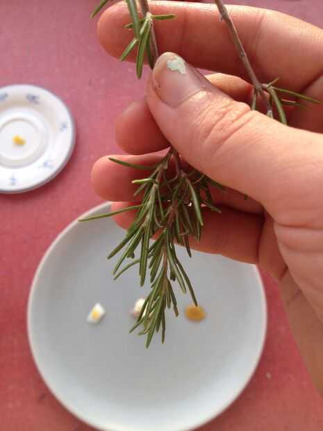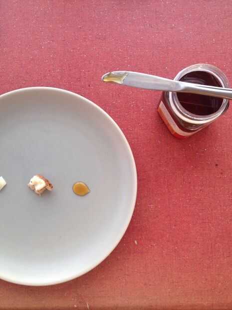 Con la punta de una cucharita, cuchillo de mantequilla o el dedo, coloque una pequeña piscina de miel a la derecha del pan. Tire suavemente de una hoja de Romero y lugar de la miel, apoyarlo en la miel la mitad y mitad en la placa.