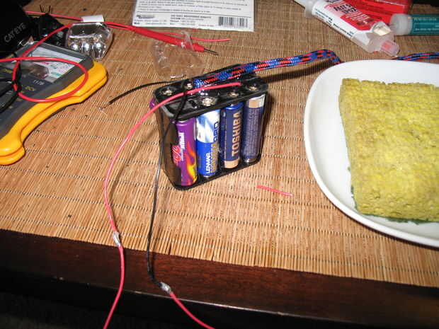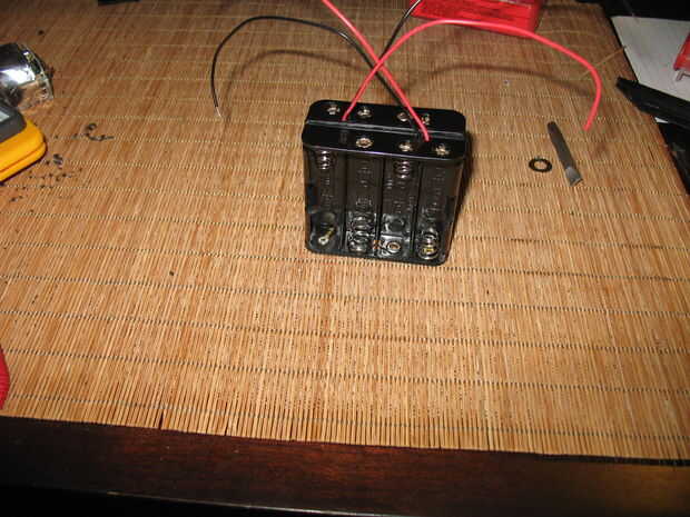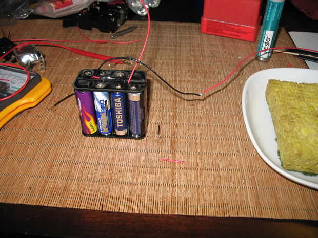 Ahora corte un rojo de un paquete y un negro de otro corto. Cinta adhesiva temporalmente, cargar las pilas y compruebe que su voltímetro muestra otra de unos 10 voltios en los otros dos cables.