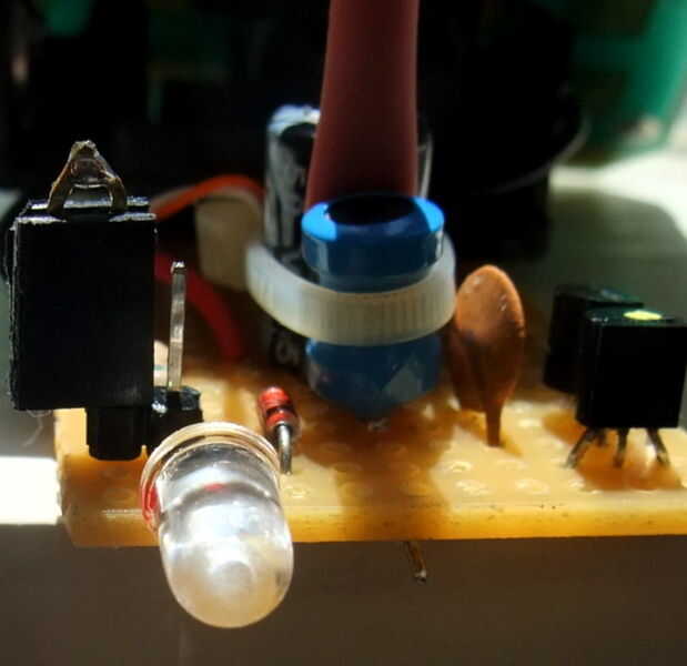 LED1 y LED2 responde a 3 propósitos. En primer lugar, limitan la salida de la bobina a unos 4.6V para que el litio no puede sobrecargarse. En segundo lugar, el LED rojo empieza a brillar cuando la batería alcanza de 3.3v y se convierte en más brillante a medida que nos acercamos a carga completa. Y finalmente, cuando se enciende el J2, LED2, una mayor potencia blanco LED es entonces encendido como la luz principal.
