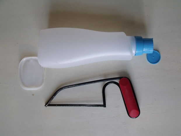 Con la Sierra de mano corte fondo de la botella y parte superior de la tapa