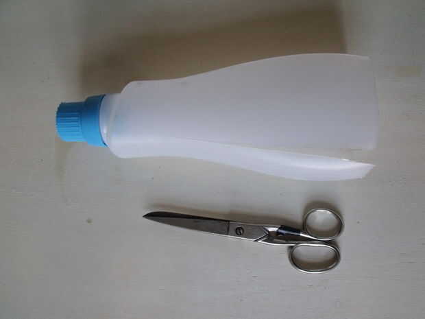 Hacer cuatro cortes largos con la tijera a lo largo de las "esquinas" de la botella.