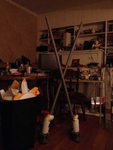 Tomé un tubo de PVC de 12 ft y cortar por la mitad. Me perforó un agujero en cada tubo en el centro y había conectado con una tuerca y un tornillo. Entonces llené dos zapatos con la espuma en aerosol, estaba parada a los extremos de los tubos de pvc en los zapatos. A continuación tomó un trozo de cartulina, enrollado en un cilindro y poner en los zapatos y lleno con la espuma en aerosol. Una vez que endurece le dará una base sólida. Mina estaba parado en su el propios, pero más adelante puso en un ángulo y cambiado de puesto y ya no se mantiene arriba por sí mismo. A continuación sólo tomó lo que pude encontrar y conducto con cinta a la estructura para cubrir en el cuerpo. Comenzó con bolsas de plástico, entonces utiliza una manta vieja. Cualquier cosa para rellenar el cuerpo. Grabado una varilla de pasador en la parte superior para que los hombros y uno en ángulo hasta la cabeza de la espiga en. Pegar con cinta adhesiva dos varillas para los brazos y me llenó apenas como el cuerpo. Luego me puse la ropa.