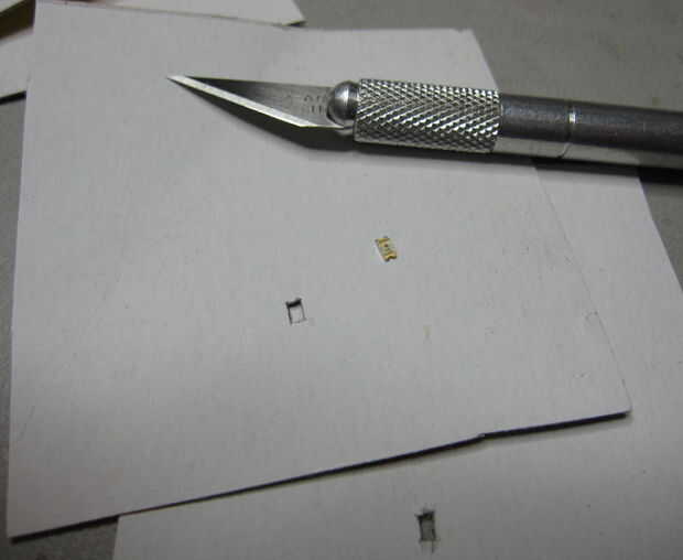 Mina corté en 3 partes después de ver que el grueso de la cartulina (0,44 mm) fue de aproximadamente 1/3 la altura del LED (1,5 mm) que estaba tratando de soldar. Aquí está una parte de 1206, pero esto funciona para piezas más pequeñas también.