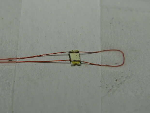 Entonces la cinta el lazo o el otro extremo del cable para que la parte tiene pelado y estañado es contra las pastillas de LED. Puede apretar el cable tirando ligeramente el extremo libre del alambre. Asegúrese de que no existe ninguna (o al menos muy poco) de espacio entre el alambre y el LED.