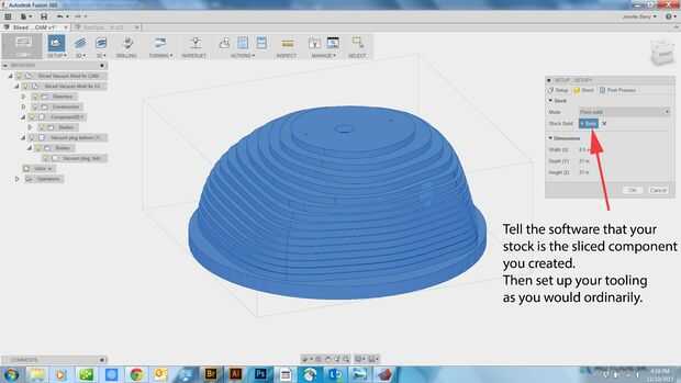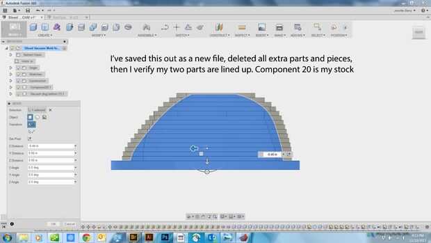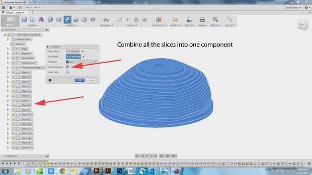 Siguiente paso es hacer todos las rebanadas una pieza para crear la acción. Bastante simple, sólo a ellos todos juntos y luego realizar en un nuevo componente. Una vez que he terminado de esto, me guarde este archivo como un nuevo y deshacerse de cualquier extras partes y piezas, así los archivos está limpio para la exportación al programa CAM.