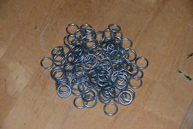 Opté por usar dos grupos de cinco, como un ejemplo. Ahora abrir cinco anillos, que la apertura un poco ancha, que hace más fácil el tejido. Prefiero abrir los anillos con la parte superior izquierda hacia mí (pero es la llamada).