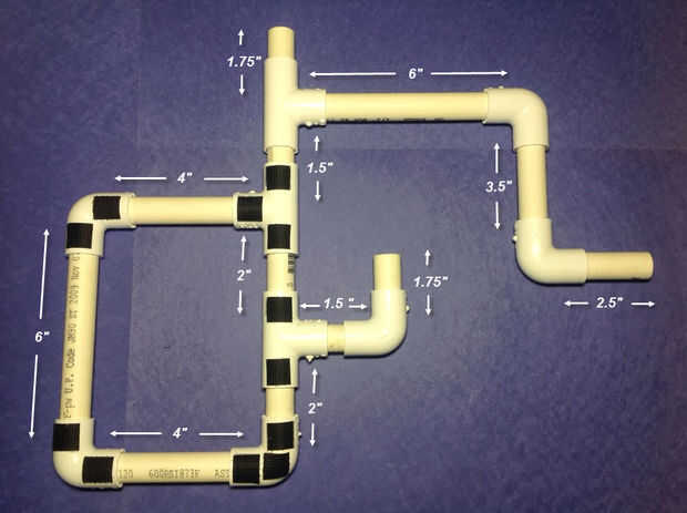 Hay dos montajes para crear para construir el caballete móvil Handheld.  Este paso describe la paleta de colores y agua envase titular de la Asamblea.  Corte varios segmentos de tubería PCV con las dimensiones como se muestra en la imagen.  Utilice una sierra para metales o una sierra trasera para cortar el tubo de PVC y utilizar el archivo de media caña para suavizar los extremos de cada segmento.  Únete a los tubos de PVC con PVC tees y codos como se muestra en la imagen.  Corte 3/4" tiras de la cinta de Velcro adhesiva cinta (el áspero lado - no la difusa) y sujete el conjunto de sujetador de paleta como se muestra en la imagen.