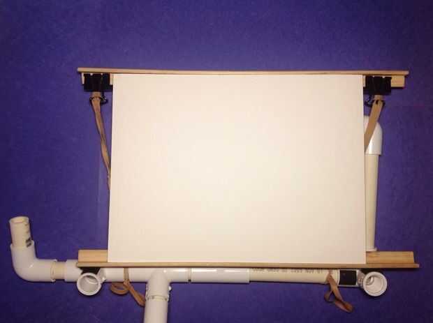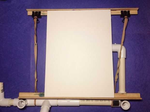 Las dos imágenes en este paso muestran cómo conectar fácilmente un bloque de 9 "x 12" de acuarela.  La primera imagen muestra el bloque de acuarela para diseños de retrato.  Resto sólo el bloque de acuarela en la moldura de esquina inferior.  Levante la moldura de esquina con los clips de la carpeta adjuntados y descansar en la parte superior del bloque de acuarela.  Los clips de la carpeta deben tener el clip de la manija con la goma hacia usted para más estabilidad.  También observe que la cadena derecha goma frente a la parte superior de la base para mayor estabilidad.  Si desea pintar con el acuarela bloque en un diseño de paisaje (ver segunda imagen) entonces asegúrese de que el media banda de goma (en lugar de la última cinta de goma) en cada una de las cadenas de goma se coloca alrededor de la tubería de PVC en la parte inferior.  Puesto que el tubo de PVC puede girar alrededor de cada una de las articulaciones en la Asamblea de mano caballete móvil puede ajustar fácilmente el ángulo de la base a su preferencia.