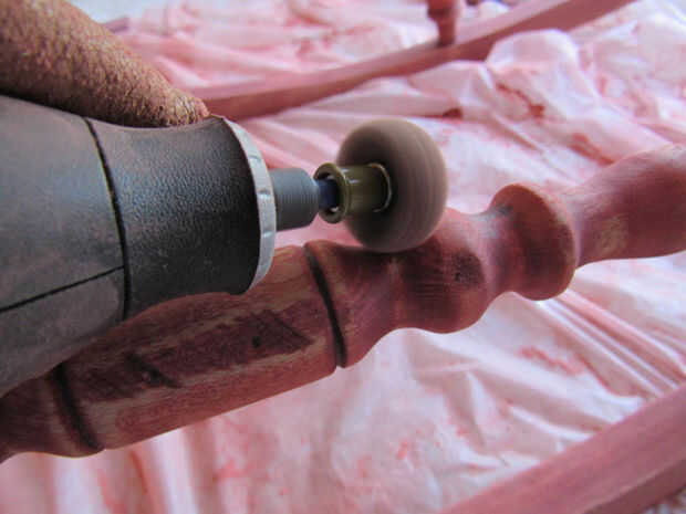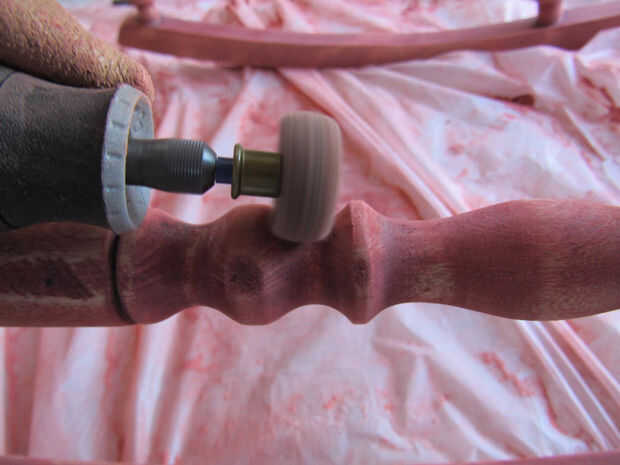Llegar a ella! Hice lo mejor pude lijar abajo pasada mancha sobra para llegar a la madera desnuda. He utilizado un bloque de lijado para todas las áreas planas, lijado a mano todos los ejes, luego utilizar mi herramienta rotatoria Dremel 4000 a 10K rpm con un abrasivo grueso (marrón) y lijado de la rueda en todas las grietas del huso.