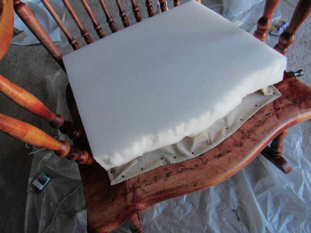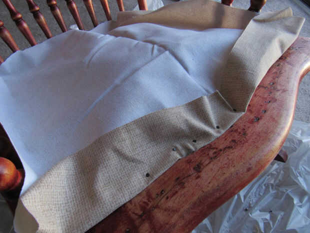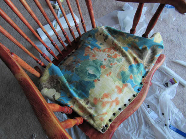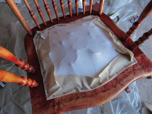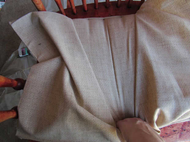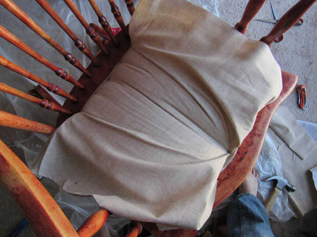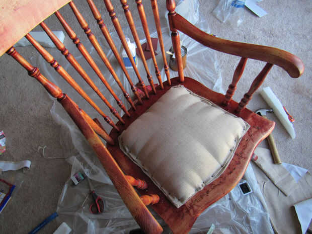 Lo que hice fue iniciar con tachuelas la segunda capa de tela en la parte posterior de la silla, luego relleno de la espuma, presionando el borde forma la tela había presionada la espuma.