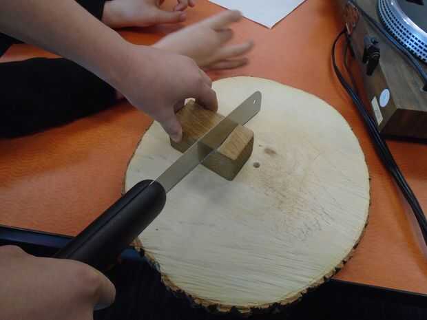 Si la madera tiene no es el tamaño correcto, ahora es el momento para cortar en cubos de 1". Usted necesitará 2 de ellos. Los cuadrados de madera ayudará a permanecer por encima de la barra del centro en el tocadiscos y guardar la máquina de conseguir pegado.