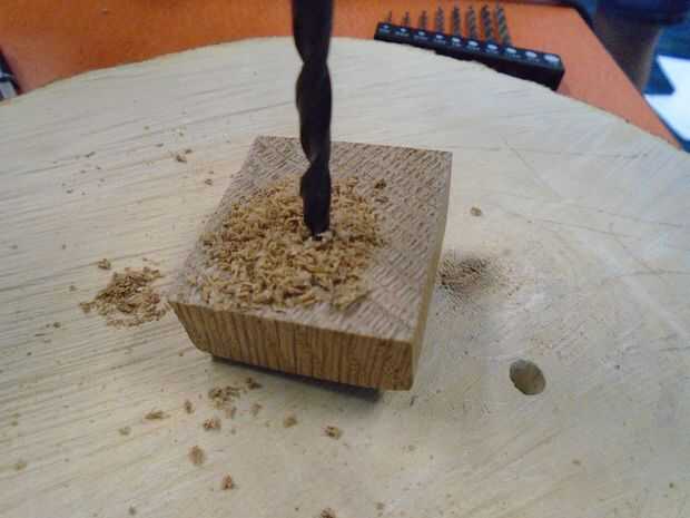 Perfore un agujero que es ligeramente más delgado que los tornillos de 1 1/4" en ambos bloques de madera. Asegúrese de que pasa a través de todo el camino.
