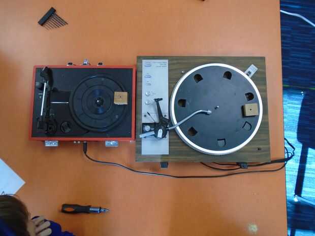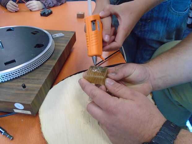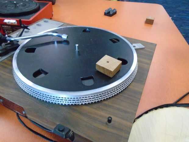Ahora decide donde quieres poner los cuadrados de madera en la tabla de la vuelta de tocadiscos. Cuanto más cerca se llega al centro de la mesa a su vez, menor será su dibujo. Decidimos ponerlo en el borde de cada rueda. Ya que teníamos cartulina, podríamos hacer grandes dibujos. Pegamento caliente es la mejor opción, porque se tira fácil que el tocadiscos puede utilizarse para la música.