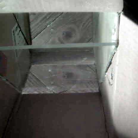 Voltee la caja, pegar el rectángulo acrílico, como el vidrio de uno, utilizar la pistola de pegamento, convertirla, otra vez, debería parecerse a esta, nota el pegamento de la pistola de pegamento, en los bordes del lado derecho.