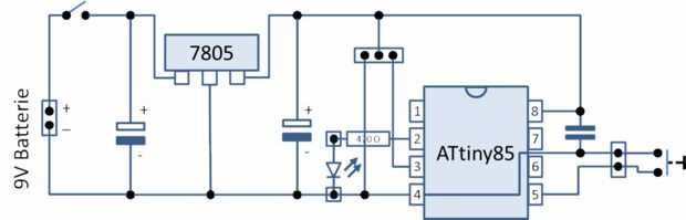 Aquí está el esquema de la Junta que he construido usando un procesador ATtiny85.