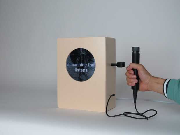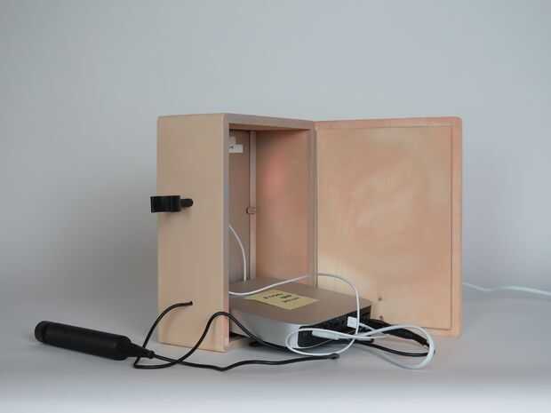 Conecte el micrófono y el iPad en el Mac Mini. Enciende la máquina y ejecutar el listener.html de cromo (poner el archivo en dropbox y ejecutar el enlace de público), con el iPad como una pantalla. Finalmente, puse todo el conjunto en la caja, cierre la cubierta posterior para arriba y listo! — Una máquina que escucha!