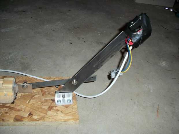 Poco globo ocular conjeturas y ensayo y error deriva rápidamente el acoplamiento ideal longitud y control de montaje en posición. He perforado unos agujeros en la palanca y montar el ensamble del gatillo del taladro original con unas abrazaderas de plástico. Esto fue cableado con algún desecho del motor y un terminal para conectar a una batería pequeña de 12v. Un poco de espuma tubo aislante y cinta aislante terminado hacia arriba la palanca con un mango cómodo. El MOSFET y el disipador de calor para el control de velocidad pueden verse un poco colgando de la manija en la imagen.