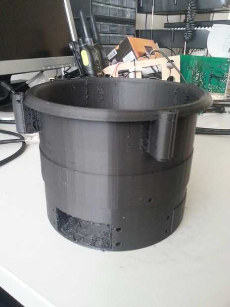La jaula de los aviones no tripulados de esfera fue cortado de papel laminado de espuma laser. Lamentablemente que no anticipamos la precisión de 0,2 mm de la cortadora láser. Las piezas encajan juntos pero no apretados como esperábamos. El conducto de admisión de aire, separador de aire y conductos de salida eran 3d impreso con ABS. Como la configuración de apoyo lejos de fueron optimizada, eliminación de las estructuras de apoyo desde dentro de los conductos eran una pesadilla. La etapa de la traducción de xy también fue impreso en significativos ABS. presentación fue hecha antes de las etapas funcionaron suavemente con la ayuda de grasa.
