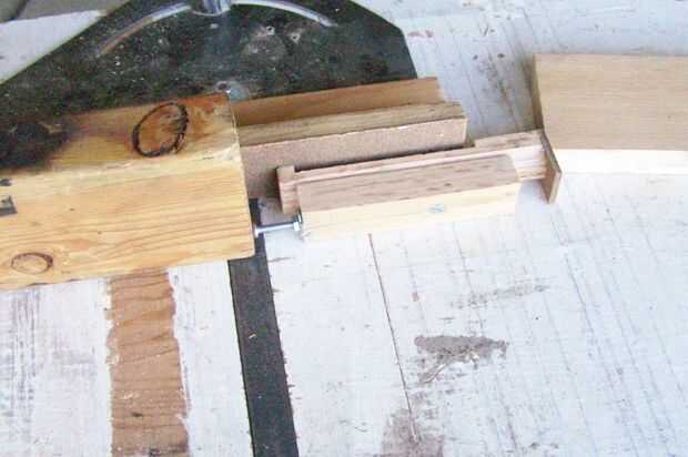 Gire el extremo kerfmaker para el final. Ahora, el lado largo de la kerfmaker establece la distancia entre el final de la 2 x 4 y la parada fija.