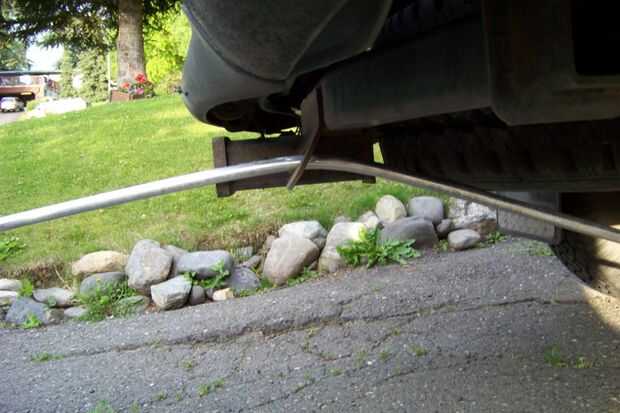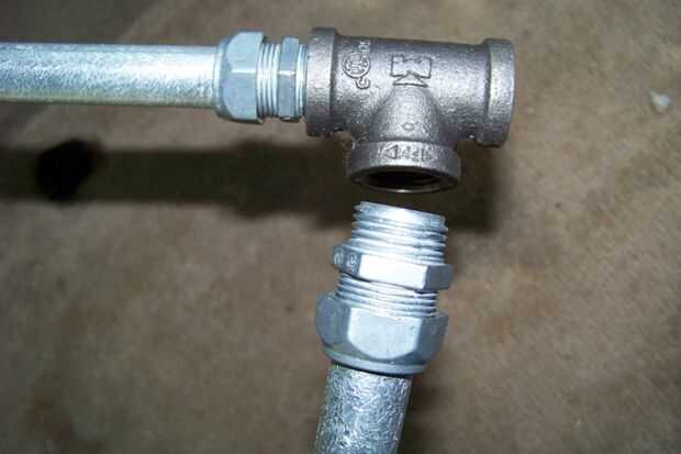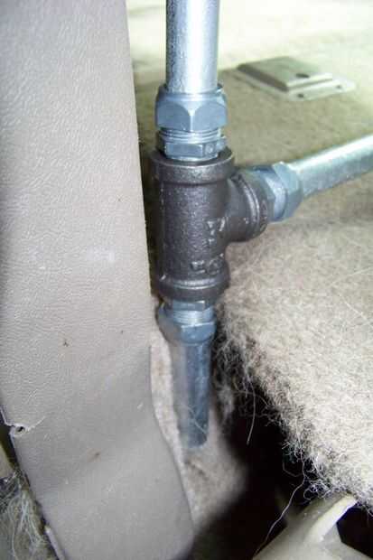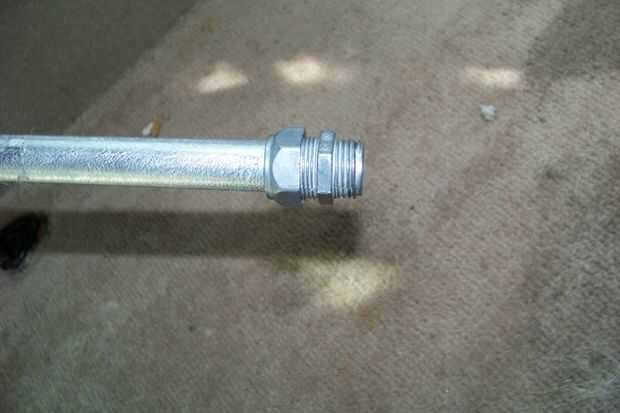 A continuación, establece el marco en el vehículo y medir la distancia entre los extremos. Restan 2 1/2 pulgadas de esa medida y luego corte una pieza recta de conducto para que la longitud. Los conectores de compresión que he comprado ponen un hilo de rosca de pipa de 1/2 pulgada en el extremo de la tubería portacables. Poniendo esto todos juntos he creado un fotograma completo. Pongo un par de pulgadas de conducto en la parte inferior que cae en un área de almacenamiento en el suburbano.