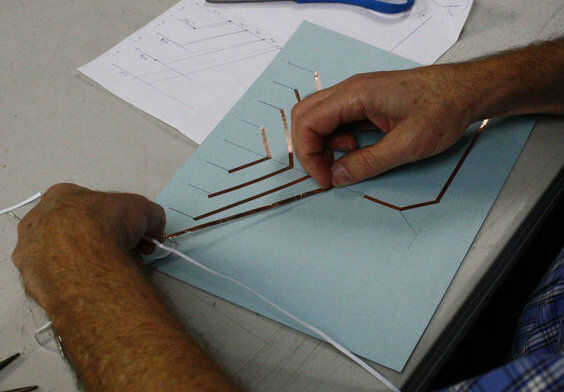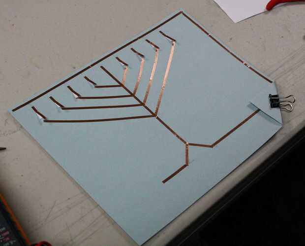 Vas a cinta sobre todas las líneas sólidas en la plantilla. Siempre que sea posible que desea ir de un extremo de una línea a la otra en una pieza única, intacta. Si la línea tiene doble puede doblar la cinta empujando hacia el punto de la curva y entonces cambiando el ángulo de la cinta. Si te puedes colgar de él hay un tutorial sobre la cinta de cobre en el sitio de Chibitronics que habla sobre la técnica de flexión. Si utiliza más de una pieza de cinta para cubrir una sola línea, deben solaparse las piezas de la cinta. No puede haber lagunas en el cobre sobre las líneas negras sólidas.