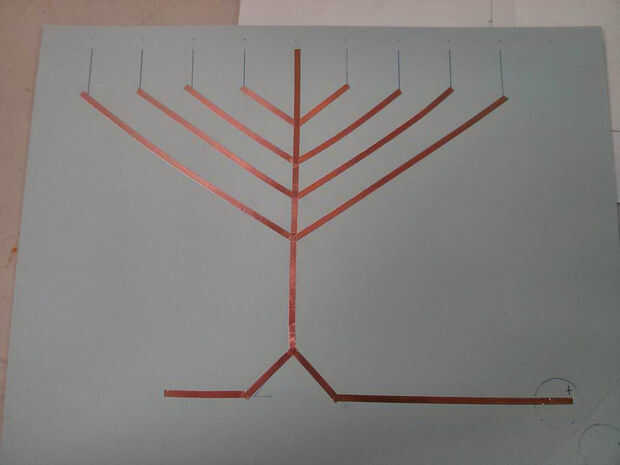 Debo mencionar aquí que los candelabros, las secciones verticales del 1" cuatro a cada lado de la vela del centro, hay que añadir por separado ya que son los interruptores que le permiten a la luz de una vela nueva cada noche. Cortar ocho trozos de cinta, 1"(2,5 cm) de largo.