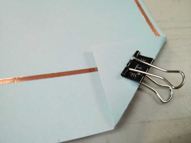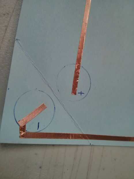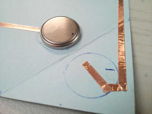 Doblar suavemente la esquina entre los círculos de dos baterías (primer cuadro). Trata de no arrugarse el cobre demasiado duro o doblar hacia adelante y hacia atrás muchas veces o se romperá. Si eso sucede puedes poner otro pedazo de cinta de cobre sobre el quebrado.