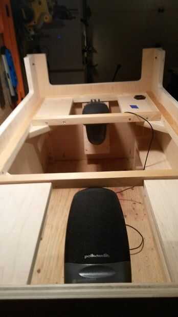 - Montado mis altavoces mirando hacia abajo en ángulo Montes (construidos de madera contrachapada final cortes) para que estén al ras con la parte inferior de la tabla. El sonido que sale de la parte inferior de la tabla en vez de directamente en el reproductor es una reminiscencia de las viejas máquinas de arcade de estilo; muchos tenían sus altavoces señaló la parte superior.
