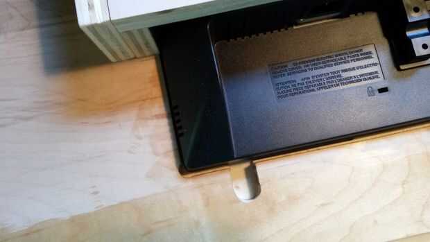 - Algunos monitores tienen tendencia a apagar cuando hay una subida de tensión (o por otras razones) y tiene que ser manualmente enciende con el botón de encendido. Si esto le sucede a la pantalla de la tabla significaría desinstalación de la pantalla para pulsar el botón de encendido. ¡ Qué dolor! Para abordar esto que utilicé mi router para enrutar hacia fuera una muesca (usando una broca recta) por lo que pude pegar una herramienta para encender sin sacar toda la pantalla. También que la ruta fuera una muesca para los botones en la parte inferior del monitor desde que salían en el monitor un poco la carcasa.