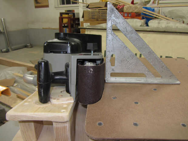 Sobre la sujeción de la lijadora hacia abajo (que debe absolutamente hacer): en mi caso, originalmente había considerado usando dos pernos largos y un pedazo de madera de la longitud del cuerpo de la lijadora para crear una fijación de la barra que mantenga pulsado. Que diseño habría puesto mucha presión sobre la tapa de la correa de transmisión de plástico del lado de la lijadora, sin embargo y probablemente habría roto la tapa, o poner tensiones indebidas en el tren de la impulsión. Después de colocar cuñas debajo de mango delantero de la lijadora, traté de sujeción justo en la parte frontal de la manija como se muestra y encontrado que es rápido, conveniente y estable. Pegado el calce en su lugar para la estabilidad y empapado al otro lado de él en pegamento para hacer menos compresible (era un corte desde el extremo de una tabla, así que tenía un montón de veta elástico).