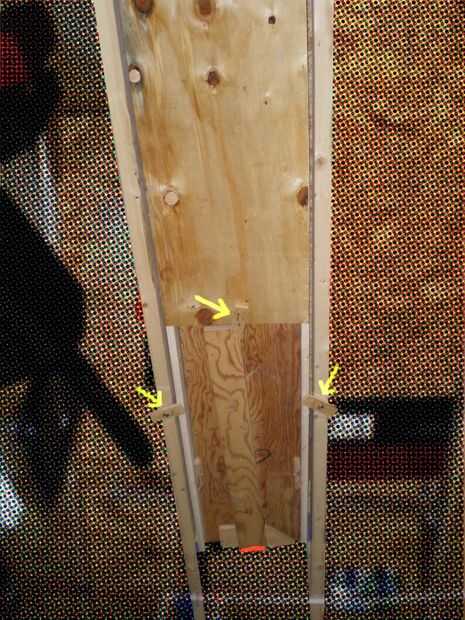 Este punto de vista de la parte inferior capta la mayor parte de la pistola de limpieza mesa mientras que se dobla en las vigas del techo. Otra vez, como en la mayoría de las fotos, he modificado los alrededores por lo que el proyecto sí mismo demuestra para arriba mejor. También he indicado al final de la bisagra de la pata de la mesa (color naranja) y el turnbuttons manteniendo el extremo de la pierna (flecha del centro) y toda la tabla para arriba. Las piezas laterales de la Asamblea de la mesa se atornilla (con una arandela de fender como una especie de cojinete) a los lados, justo por encima de la parte superior de la foto.