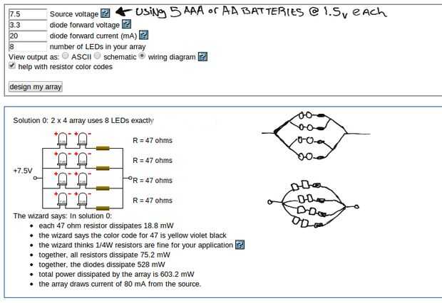 Usted puede fácilmente averiguar lo que usted necesita, incluyendo las resistencias, utilizando el Asistente de matriz de LED serie/paralelo.