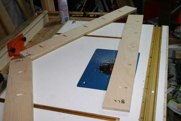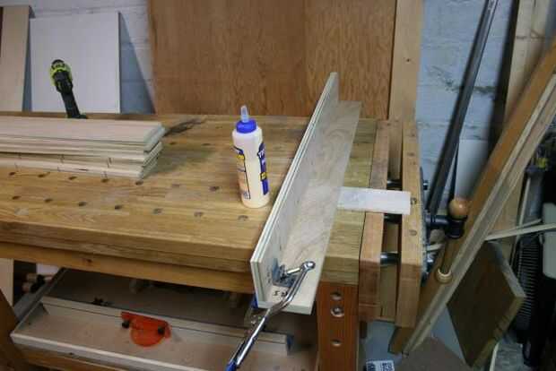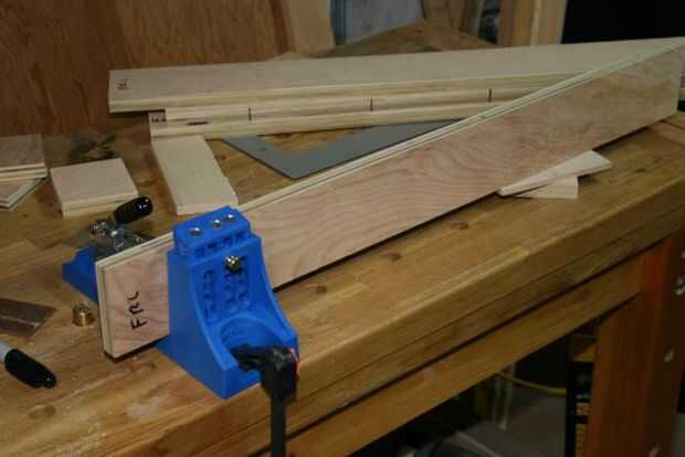 Cada pata consta de un par de 3/4 capas juntas, en un ángulo recto. Norma utiliza pegamento y un cortador de la galleta, para unir a su. No tengo un cortador de la galleta, y no podía ver bastante futuros productos para justificar el precio, así que usé tornillos de agujero de bolsillo de Kreg y pegamento.