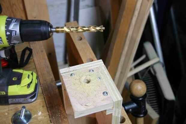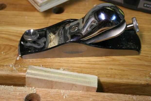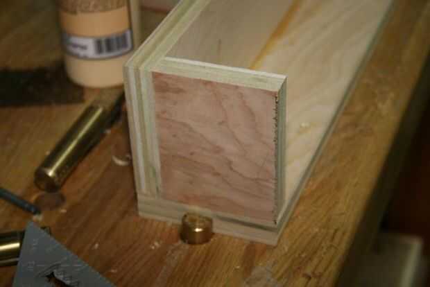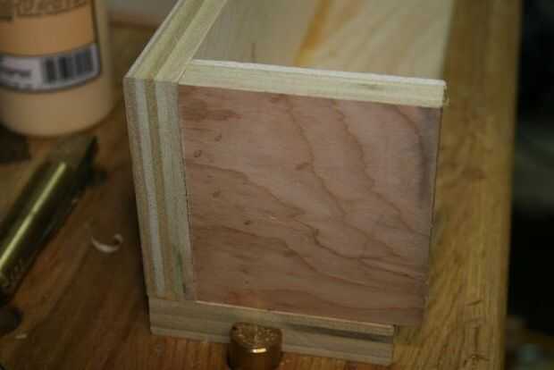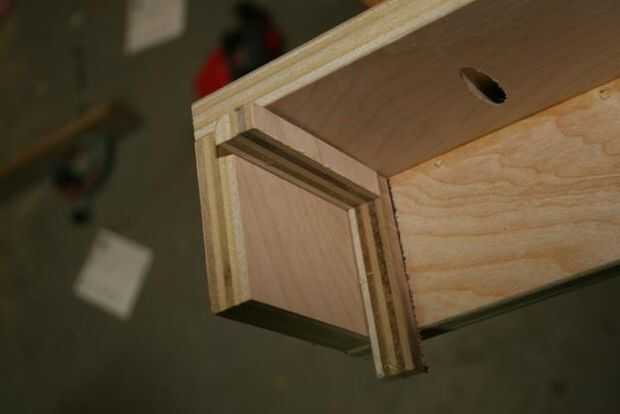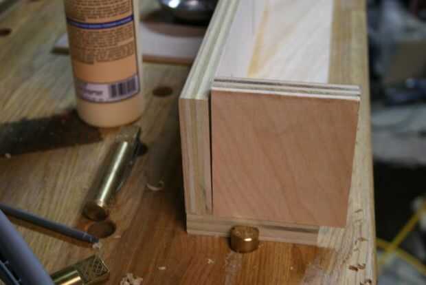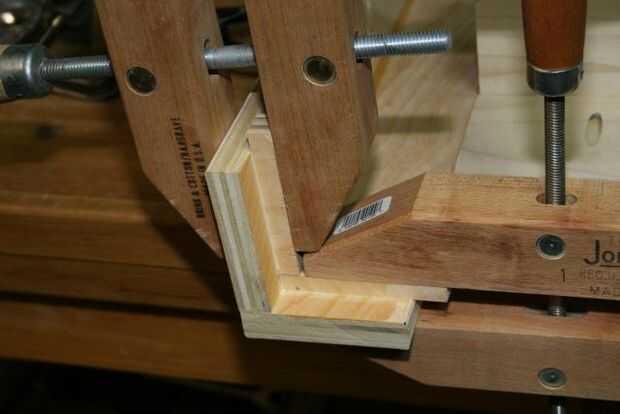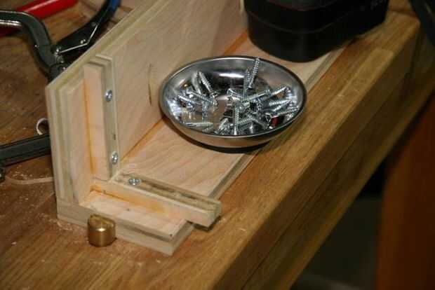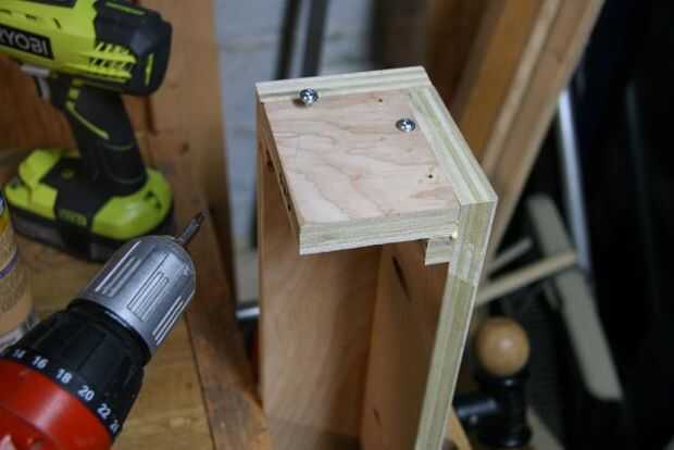 Quería añadir una pieza cuadrada, llenando el ángulo en el extremo de cada pierna, a través del cual pude montar mi niveladores. Quisiera no se molestó en Asegúrese de que la hoja era cuadrada, así que mis cantos no eran muy cuadrados, y por lo tanto, las dos partes de cada pierna no Únete a exactamente un ángulo recto. Por ello mis piezas "cuadrado" necesitan un poco de trabajo con un plano de bloque. Una vez que tenían instalado, yo pegado y atornillado un par de piezas de desecho, para proporcionar apoyo, luego pegados y atornillados mis piezas