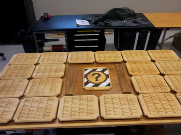 Para dar una idea del tamaño de este proyecto. Las tarjetas de nombre se disponen en una pieza de 4 X 8 de madera contrachapada. El pedazo entonces se encuentra en 2 piezas de madera contrachapada de 4 x 8. Así que en el final 8' X 8'.