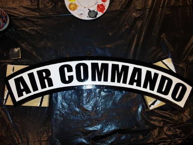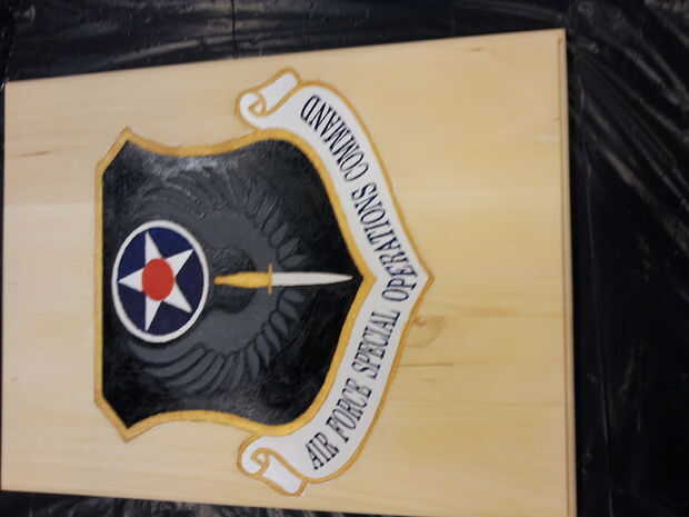 Al lado verás dos emblemas pintados. El escudo es de AFSOC (comando de operación especial de la fuerza aérea) y el otro es el parche de nuestra unidad. Estos fueron grabados y luego mano pintado para darle contraste contra las otras tablas.