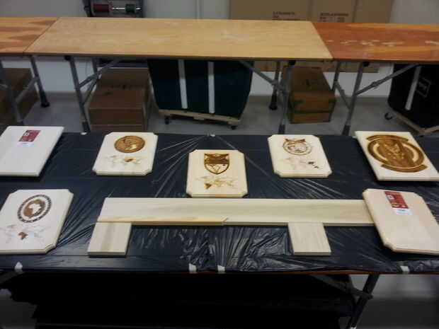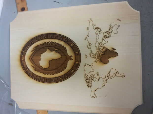 La ficha 28" fue grabada fuera de pino amarillo y fue grabada con la misma configuración como las tarjetas de nombre, excepto el final utiliza la configuración de vectores para la máquina de 120 vatios y una arboleda de 3/8" dos veces. Esto permitió que la pieza a cortar el resto de la Junta limpia.